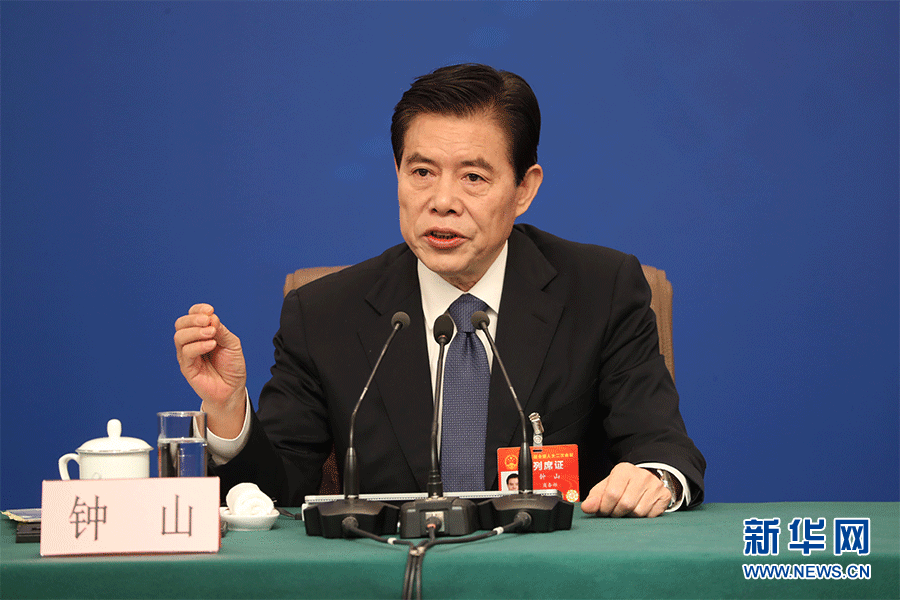十三屆全國人大二次會議新聞中心3月9日(星期六)10時30分在梅地亞中心新聞發(fā)布廳舉行記者會,邀請商務(wù)部部長鐘山、副部長兼國際貿(mào)易談判副代表王受文、副部長錢克明就“促進(jìn)形成強大國內(nèi)市場 推動全方位對外開放”相關(guān)問題回答中外記者提問。圖為商務(wù)部部長鐘山。新華網(wǎng)/中國政府網(wǎng) 陳杰 攝