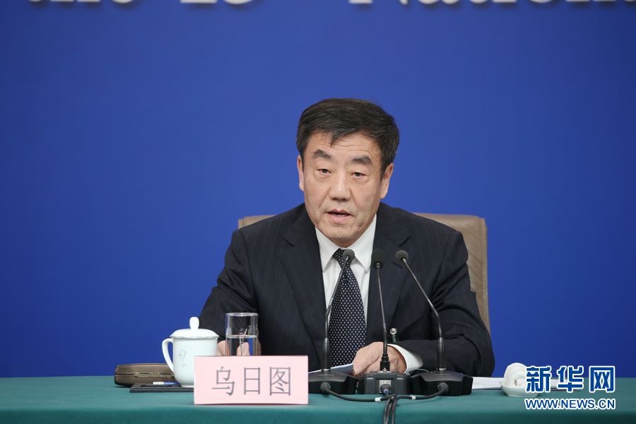 十三屆全國人大二次會議新聞中心3月9日在梅地亞中心新聞發(fā)布廳舉行記者會,邀請全國人大農(nóng)業(yè)與農(nóng)村委員會主任委員陳錫文、全國人大財政經(jīng)濟委員會副主任委員烏日圖、全國人大常委會法制工作委員會副主任劉俊臣、全國人大常委會法制工作委員會副主任許安標、全國人大環(huán)境與資源保護委員會委員程立峰就“人大立法工作”相關(guān)問題回答記者提問。圖為全國人大財政經(jīng)濟委員會副主任委員烏日圖。新華網(wǎng)/中國政府網(wǎng) 劉廈 攝