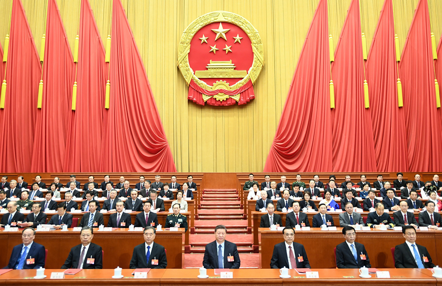 習(xí)近平、李克強、汪洋、王滬寧、趙樂際、韓正、王岐山和大會主席團成員在主席臺就座。