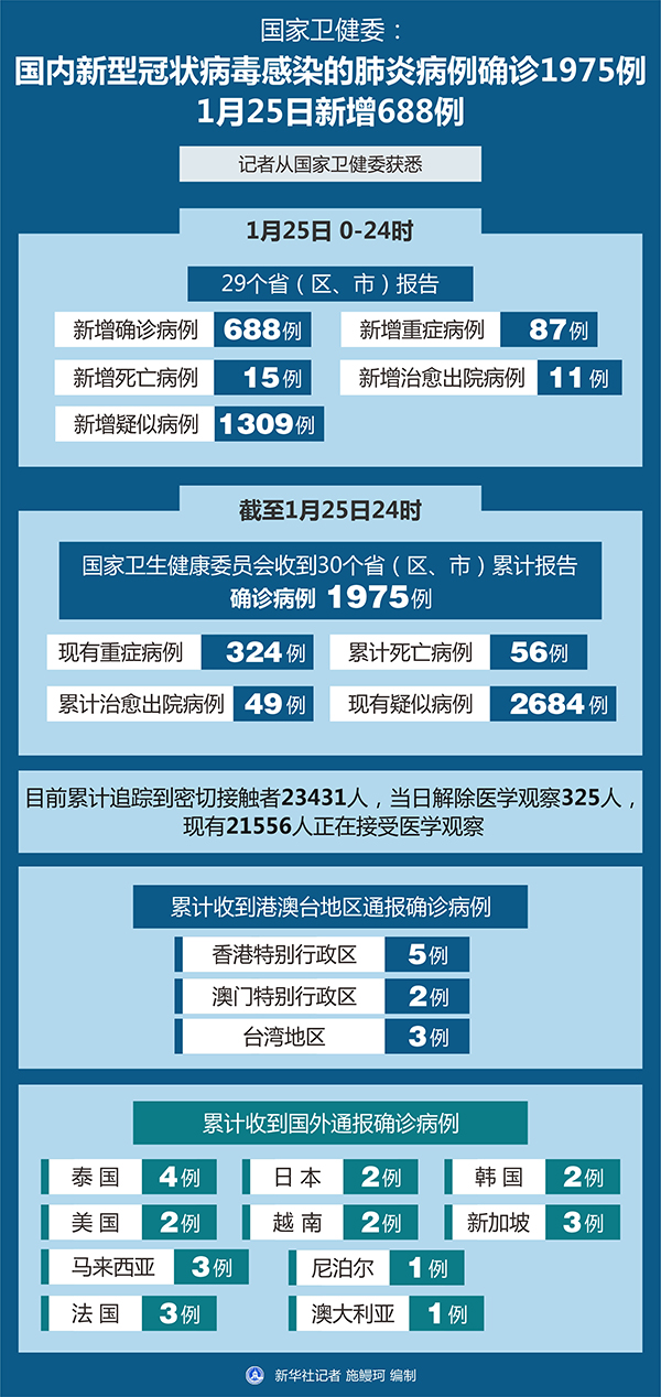 截至1月25日24時,國家衛(wèi)生健康委員會收到30個?。▍^(qū)、市)累計報告確診病例1975例,現(xiàn)有重癥病例324例。累計死亡病例56例,累計治愈出院病例49例?,F(xiàn)有疑似病例2684例。