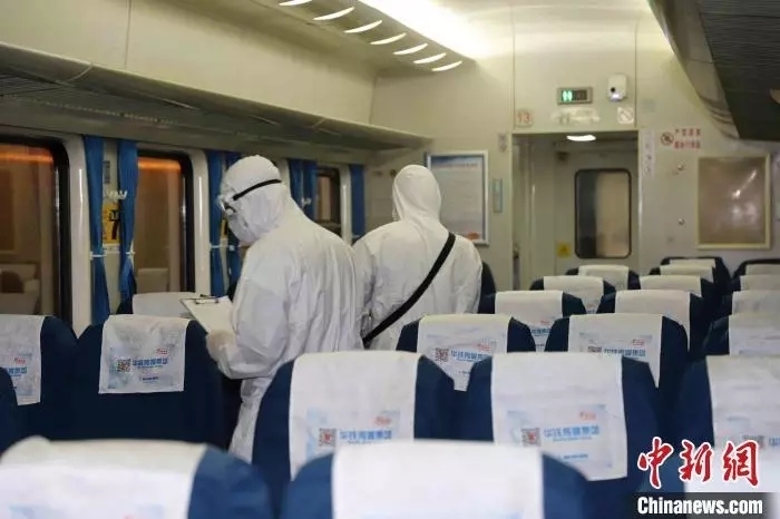 在車上,廣州鐵路疾控中心工作人員正全副武裝對列車進行全面消毒。帶隊作業(yè)的廣州鐵路疾控中心主任楊裕楨介紹:“根據(jù)目前疫情的情況,我們的工作整體上包括消毒、檢疫、防護和保障有四大塊?!睋?jù)介紹,鐵路部門按照屬地政府的工作安排,采取預(yù)防性消毒、隨車消毒和終末消毒等方式,每日對候車室、旅客列車進行消毒。加強車站和旅客列車空調(diào)通風設(shè)施檢查、維修和消毒,做好候車室和旅客列車通風換氣,保持室(車)內(nèi)空氣清新。