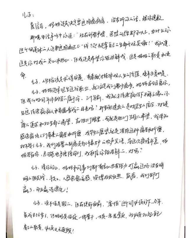 在較早收治確診病例的湖南省郴州市第二人民醫(yī)院,一封抗疫醫(yī)生的家書引人注目。家書是作為醫(yī)生的媽媽,在即將進入隔離病房前,寫給帶女朋友回家過年的兒子的。