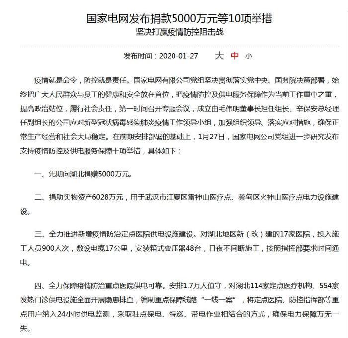 在前期安排部署的基礎(chǔ)上,1月27日,國家電網(wǎng)公司黨組進一步研究發(fā)布支持疫情防控及供電服務(wù)保障十項舉措,具體如下: