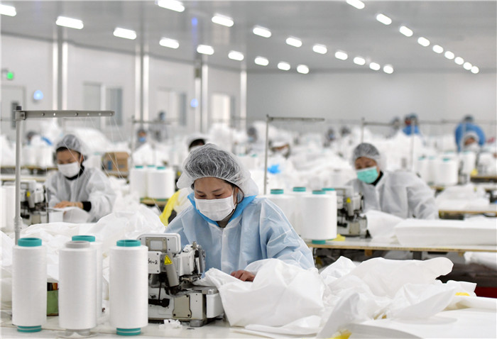 1月28日,在武漢市新洲區(qū)武漢協(xié)卓衛(wèi)生用品有限公司,工人在趕制防護服,該公司是生產手術服、防護服等產品的企業(yè)。 新華社記者 才揚 攝