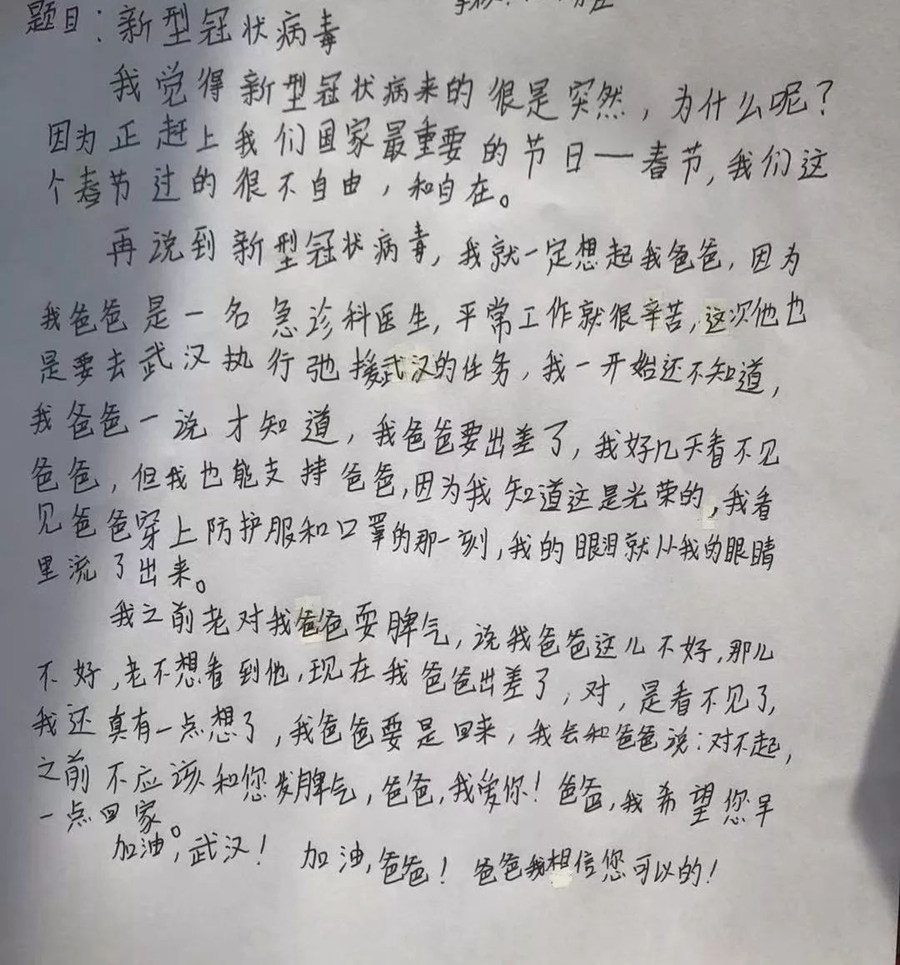 信里他先反思了一下自己,說以前盼望著爸爸上班,不希望爸爸在家管他?,F(xiàn)在爸爸去前線,我想到危險(xiǎn)性,現(xiàn)在又特別希望爸爸安安全全地回家,然后還說了一句,爸爸我愛你!以前從來沒有過。我跟他說,我希望你在生活和學(xué)習(xí)中面對(duì)困難,無所畏懼,一直向前,我還說爸爸不一定是你的驕傲,但一定要做你的榜樣。