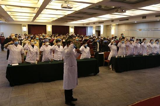 1月27日,在武漢市蔡甸區(qū)執(zhí)行新型冠狀病毒肺炎疫情援助任務(wù)的遼寧省醫(yī)療隊(duì),成立臨時(shí)黨支部,全體醫(yī)護(hù)人員向黨旗鄭重宣誓,堅(jiān)決打贏新冠肺炎疫情防控阻擊戰(zhàn)。