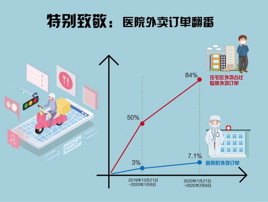 “餓了么”數(shù)據(jù)顯示,自疫情爆發(fā)以來(lái),醫(yī)院的外賣訂單占比上升了一倍,加班加點(diǎn),外賣訂單猛增,讓我們向戰(zhàn)斗在一線的醫(yī)務(wù)工作者致敬!