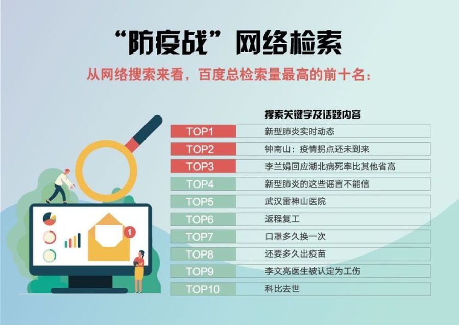 在百度搜索平臺(tái),日均超過(guò)10億人次搜索與“新冠肺炎”疫情有關(guān)的消息。“鐘爺爺”、“李奶奶”的發(fā)言最受關(guān)注,排名熱搜前列。
