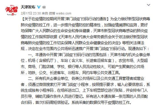據(jù)天津市政府新聞辦微博消息,天津市新型冠狀病毒感染的肺炎疫情防控工作指揮部日前發(fā)布通告稱(chēng),自2月17日起,天津市域內(nèi),凡進(jìn)入機(jī)關(guān)企事業(yè)單位,機(jī)場(chǎng)、車(chē)站、商場(chǎng)、學(xué)校、銀行等公共場(chǎng)所,乘坐地鐵、公交、出租車(chē)等公共交通工具,所有人員須配合掃碼,系統(tǒng)采集的數(shù)據(jù)僅用于疫情防控工作。