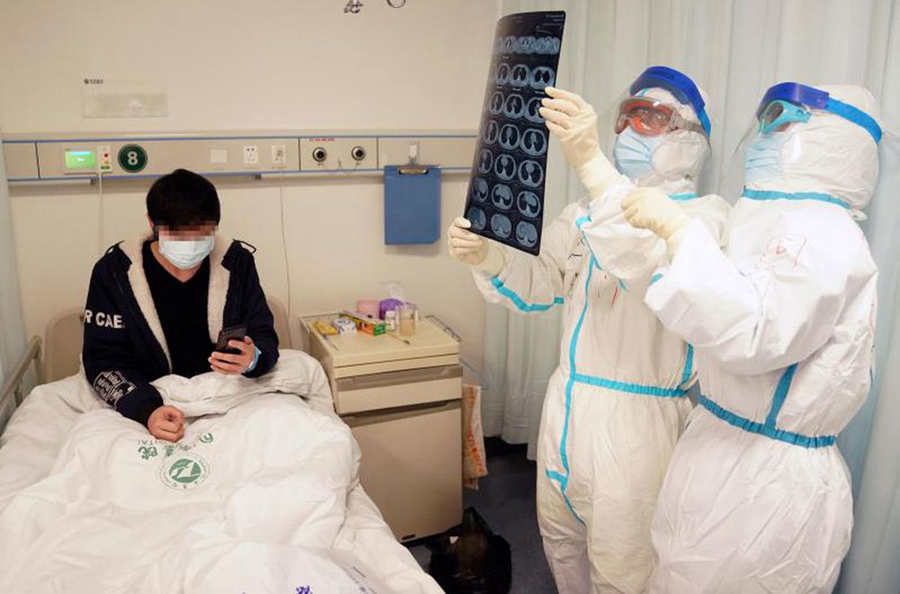 2月18日,專家趙建平(右二)與醫(yī)生周瑩在同濟(jì)醫(yī)院中法新城院區(qū)新冠肺炎重癥病區(qū),一起觀看患者的CT片。新華社記者王毓國 攝