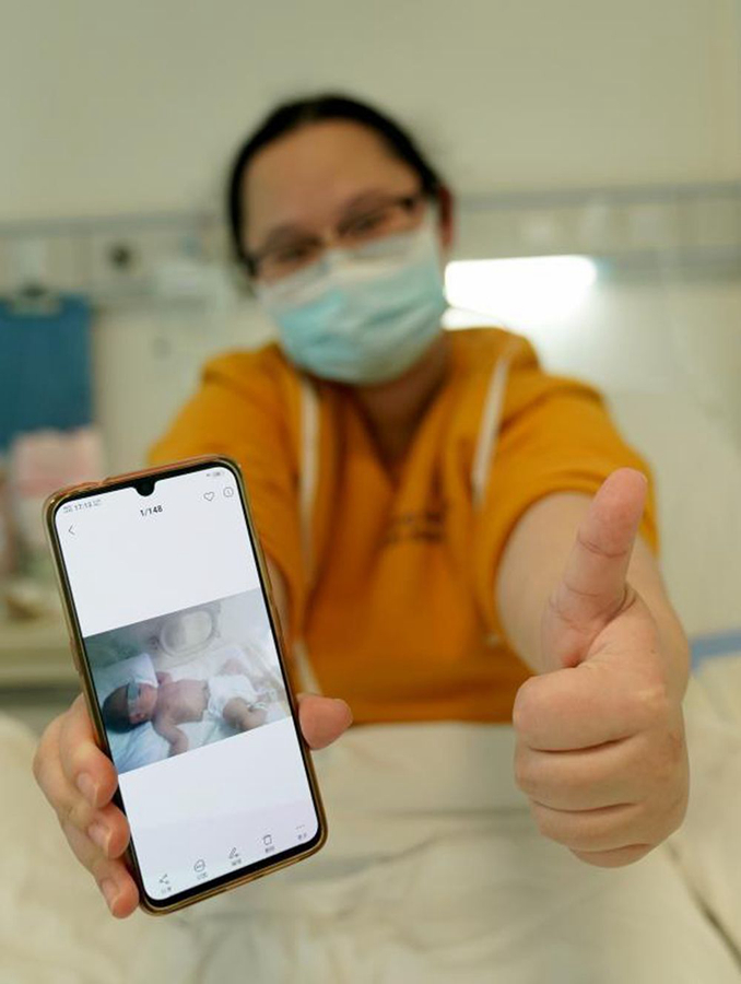 2月18日,楊女士展示手機(jī)中自己兒子的照片。在武漢華中科技大學(xué)同濟(jì)醫(yī)院中法新城院區(qū)新冠肺炎重癥病區(qū)住院的楊女士是武漢人,在身患新冠肺炎后剖腹產(chǎn)下一名男嬰。嬰兒目前在醫(yī)院進(jìn)行隔離觀察,但各項指標(biāo)均正常。當(dāng)楊女士知道孩子的情況后,懸著的心終于放下。在醫(yī)護(hù)人員的努力下,她的病情也有了好轉(zhuǎn)。新華社記者王毓國 攝