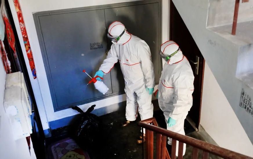 2月17日,上海市黃浦區(qū)五里橋街道申杰物業(yè)公司工作人員李強(qiáng)(左)對(duì)已經(jīng)封裝好的居家隔離居民生活垃圾噴灑消毒水。新華社記者 方喆 攝