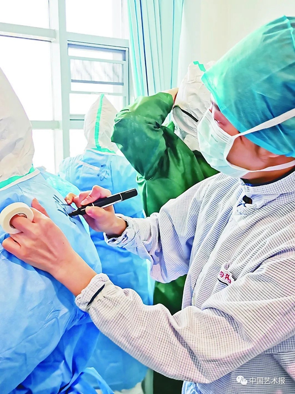 2月22日,武漢華中科技大學同濟醫(yī)學院附屬同濟醫(yī)院中法新城院區(qū),北京醫(yī)院國家醫(yī)療隊負責的病區(qū)。醫(yī)護人員在防護服上寫下姓名,整裝待發(fā)。中國攝協(xié)赴湖北抗擊疫情攝影小分隊 陳黎明 攝