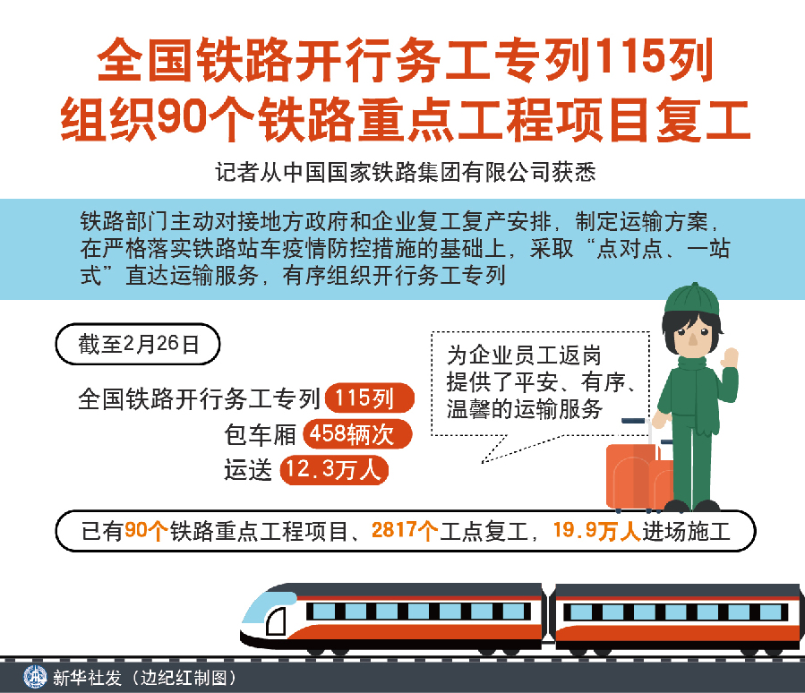 圖表:全國鐵路開行務工專列115列 組織90個鐵路重點工程項目復工 新華社發(fā) 邊紀紅 制圖