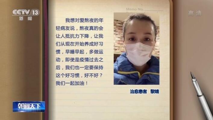 我想對愛熬夜的年輕病友說,熬夜真的會讓人抵抗力下降,讓我們從現(xiàn)在開始養(yǎng)成好習(xí)慣,早睡早起,多做運(yùn)動,即使是疫情過去之后,我們也一定要保持這個好習(xí)慣,好不好?我們一起加油! ——治愈患者黎婧