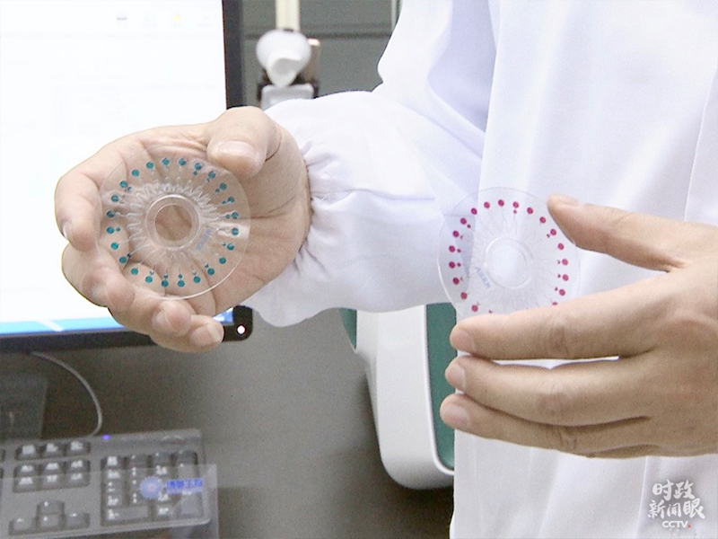 圖中藍(lán)色序號(hào)前6種呼吸道病毒,能夠被全新微流控芯片系統(tǒng)一次性檢測(cè)出來(lái)。(總臺(tái)央視記者韓銳拍攝)