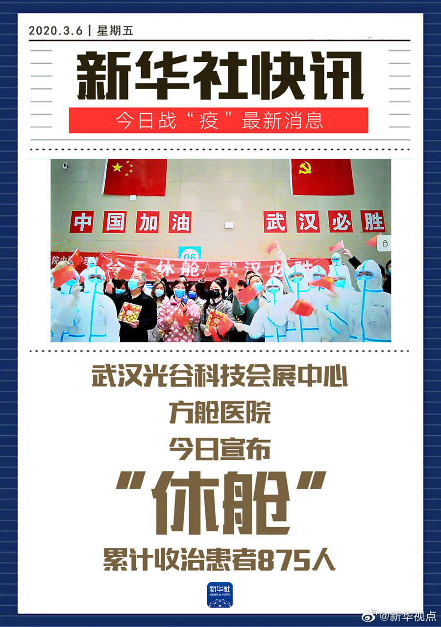 3月6日,武漢光谷科技會展中心方艙醫(yī)院宣布“休艙”。2月17日,該方艙醫(yī)院正式開始收治患者,累計(jì)收治患者875人。