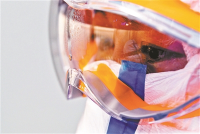25℃的室溫,再加上密閉的防護(hù)服,王兆娥能感覺(jué)到身上的汗在往下淌,護(hù)目鏡上已經(jīng)起了一層霧