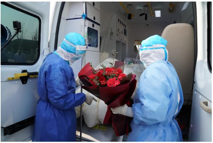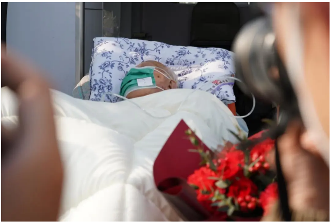 7日下午4點(diǎn)左右,辦理好出院手續(xù)后,醫(yī)護(hù)人員用醫(yī)用平車將100周歲的治愈患者王大爺推到醫(yī)院門口,抬上轉(zhuǎn)運(yùn)車輛。