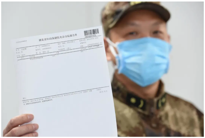 醫(yī)務(wù)人員向記者展示老人的新冠病毒核酸檢測陰性報(bào)告單 攝影:趙佳慶