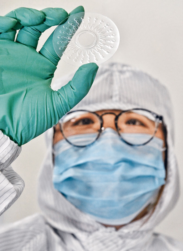 由國內(nèi)幾家科研機構(gòu)聯(lián)合攻關(guān)開發(fā)的包括新冠病毒在內(nèi)的呼吸道病毒(6種)核酸檢測試劑盒(恒溫擴增芯片法),只需采集患者的鼻、咽拭子等分泌物樣本,在1.5小時內(nèi)便可一次性檢測包括新冠病毒在內(nèi)的6種呼吸道病毒。圖為科技人員在展示恒溫擴增芯片。新華社記者 劉坤/攝