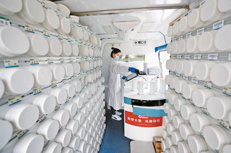 在武漢江夏方艙醫(yī)院的“流動應(yīng)急智能中藥房”里,工作人員把盛有藥方中包含的單味藥的藥瓶取下來后,逐一掃描確認(rèn),準(zhǔn)備制藥。新華社記者 沈伯韓/攝
