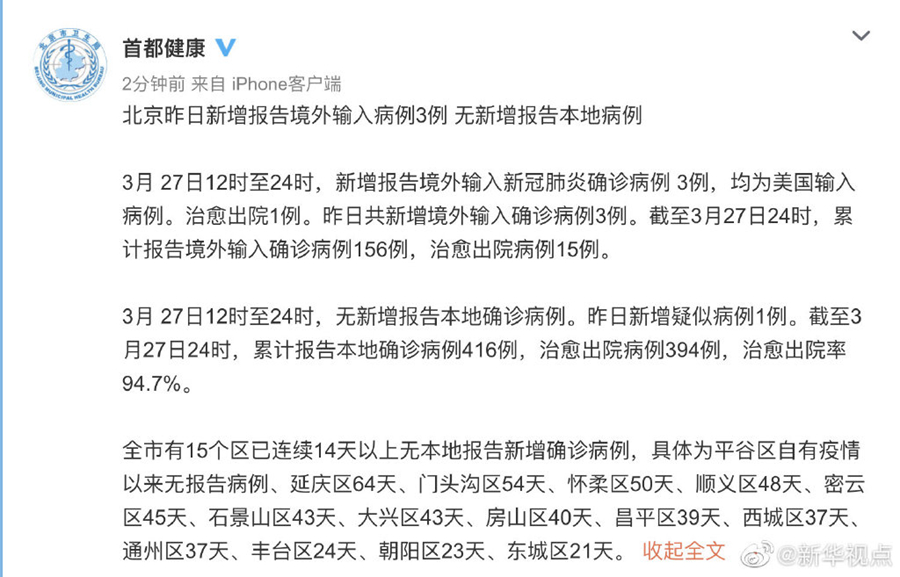 3月27日12時(shí)至24時(shí),新增報(bào)告境外輸入新冠肺炎確診病例3例,均為美國(guó)輸入病例。治愈出院1例。昨日共新增境外輸入確診病例3例。截至3月27日24時(shí),累計(jì)報(bào)告境外輸入確診病例156例,治愈出院病例15例。