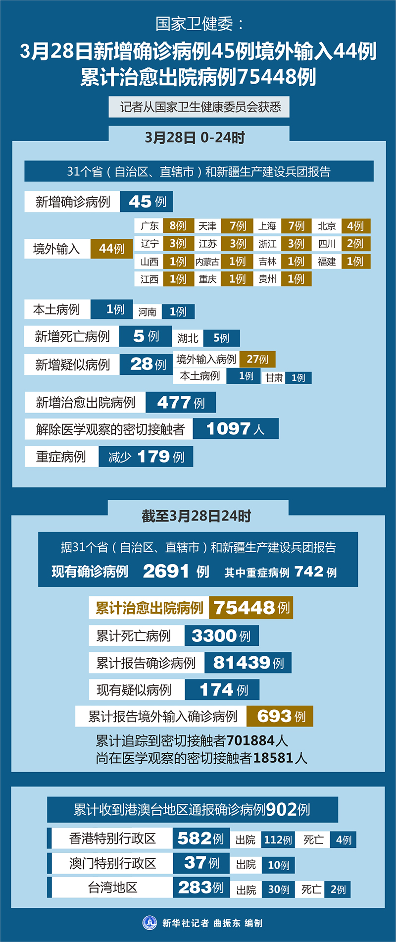 截至3月28日24時,據31個省(自治區(qū)、直轄市)和新疆生產建設兵團報告,現有確診病例2691例(其中重癥病例742例),累計治愈出院病例75448例,累計死亡病例3300例,累計報告確診病例81439例,現有疑似病例174例。累計追蹤到密切接觸者701884人,尚在醫(yī)學觀察的密切接觸者18581人。