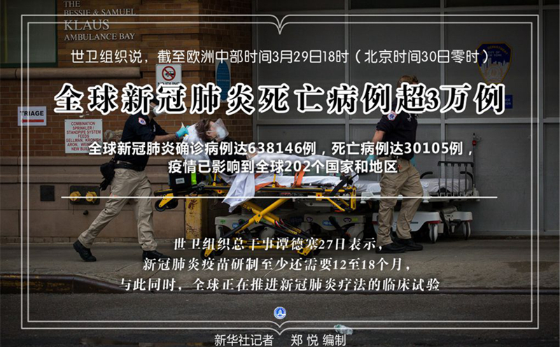 世衛(wèi)組織說,截至歐洲中部時間29日18時(北京時間30日零時),全球新冠肺炎確診病例達(dá)638146例,死亡病例達(dá)30105例,疫情已影響到全球202個國家和地區(qū)。