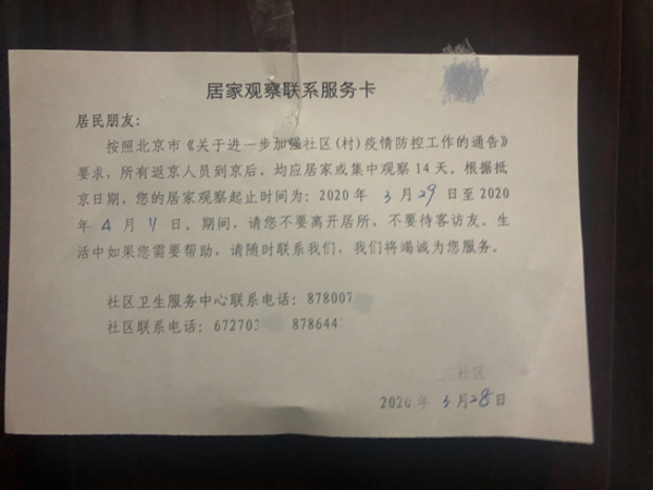 8、交接:車輛到達(dá)社區(qū)后,隨行的街道干部同社區(qū)工作人員進(jìn)行交接。返京人員在測(cè)量體溫、簽署《居家觀察個(gè)人告知書》等文件后,由社區(qū)工作人員送至家中。居家觀察的14天內(nèi),將嚴(yán)格禁止外出、會(huì)客等行為,由社區(qū)安排專人幫助解決生活困難。