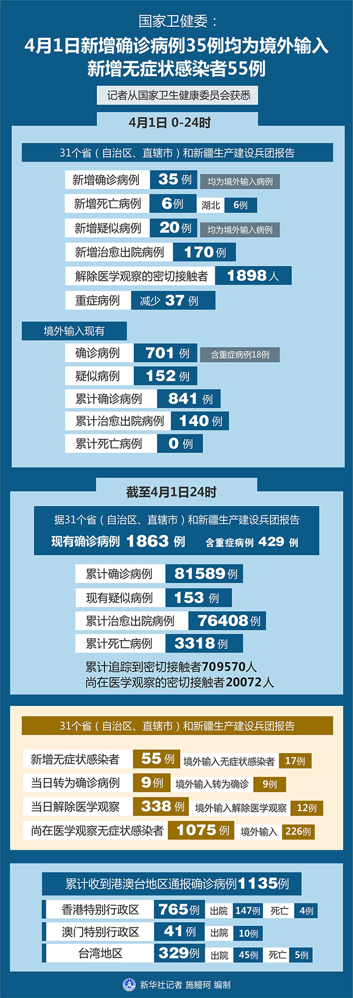 截至4月1日24時,據(jù)31個?。ㄗ灾螀^(qū)、直轄市)和新疆生產(chǎn)建設(shè)兵團(tuán)報告,現(xiàn)有確診病例1863例(含重癥病例429例),現(xiàn)有疑似病例153例。累計確診病例81589例,累計治愈出院病例76408例,累計死亡病例3318例,累計追蹤到密切接觸者709570人,尚在醫(yī)學(xué)觀察的密切接觸者20072人。