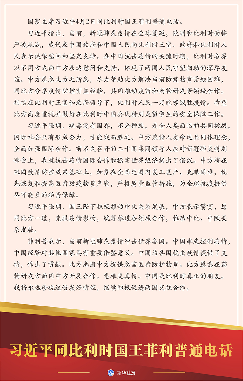 習(xí)近平指出,當(dāng)前,新冠肺炎疫情在全球蔓延,歐洲和比利時面臨嚴(yán)峻挑戰(zhàn),我代表中國政府和中國人民向比利時王室、政府和比利時人民表示誠摯慰問和堅定支持。在中國抗擊疫情的關(guān)鍵時期,比利時各界以不同方式向中方表達(dá)慰問和支持,體現(xiàn)了兩國人民守望相助的深厚友誼。中方愿急比方之所急,盡力幫助比方解決當(dāng)前防疫物資緊缺困難,同比方分享疫情防控有益經(jīng)驗(yàn),共同推動疫苗和藥物研發(fā)等領(lǐng)域合作。相信在比利時王室和政府領(lǐng)導(dǎo)下,比利時人民一定能夠戰(zhàn)勝疫情。希望比方高度重視并做好在比利時中國公民特別是留學(xué)生的安全保障工作。