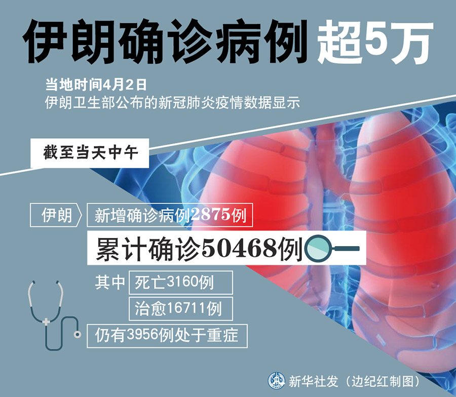 新華社德黑蘭4月2日電(記者陳霖)伊朗衛(wèi)生部2日公布的新冠肺炎疫情數(shù)據(jù)顯示,截至當(dāng)天中午,伊朗新增確診病例2875例,累計(jì)確診50468例,其中死亡3160例,治愈16711例,仍有3956例處于重癥。