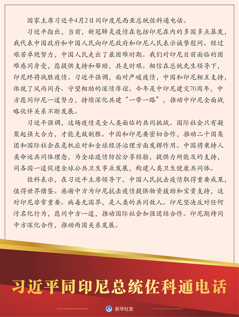 佐科表示,在習近平主席領(lǐng)導下,中國人民抗擊疫情取得重要成果,值得世界借鑒。感謝中方為印尼抗擊疫情提供物資援助和寶貴支持,這對印尼非常重要。病毒無國界,是人類的共同敵人。印尼堅決反對任何污名化行為,愿同中方一道,推動國際社會加強團結(jié)合作。印尼期待同中方深化合作,推動兩國關(guān)系發(fā)展。