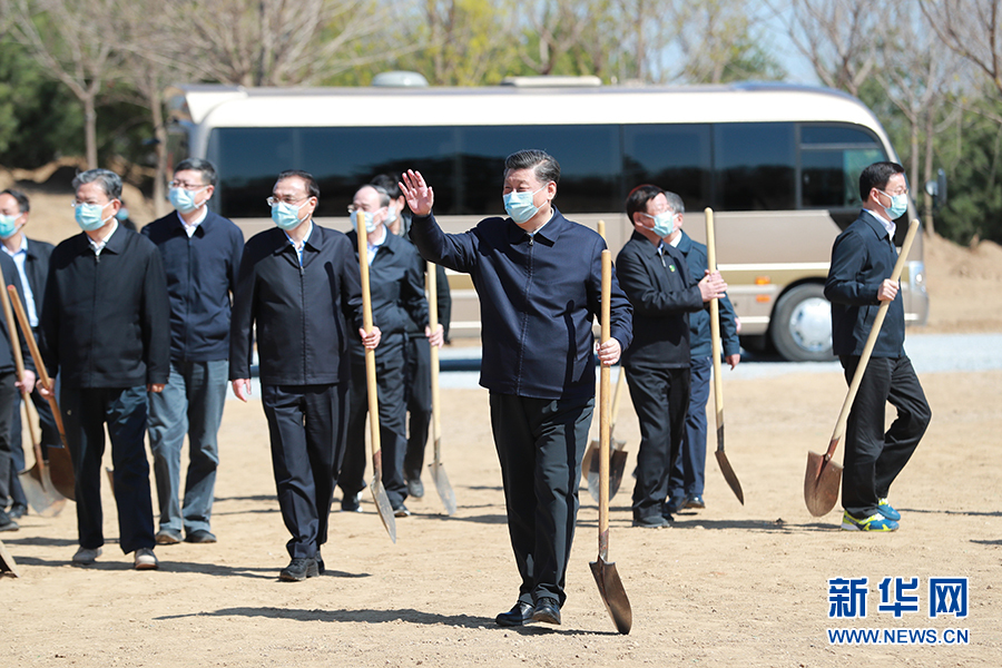 4月3日,黨和國家領(lǐng)導(dǎo)人習(xí)近平、李克強(qiáng)、栗戰(zhàn)書、汪洋、王滬寧、趙樂際、韓正、王岐山等來到北京市大興區(qū)舊宮鎮(zhèn)參加首都義務(wù)植樹活動(dòng)。這是習(xí)近平拿起鐵鍬走向植樹地點(diǎn),向正在植樹的干部群眾揮手致意。 新華社記者 丁海濤 攝