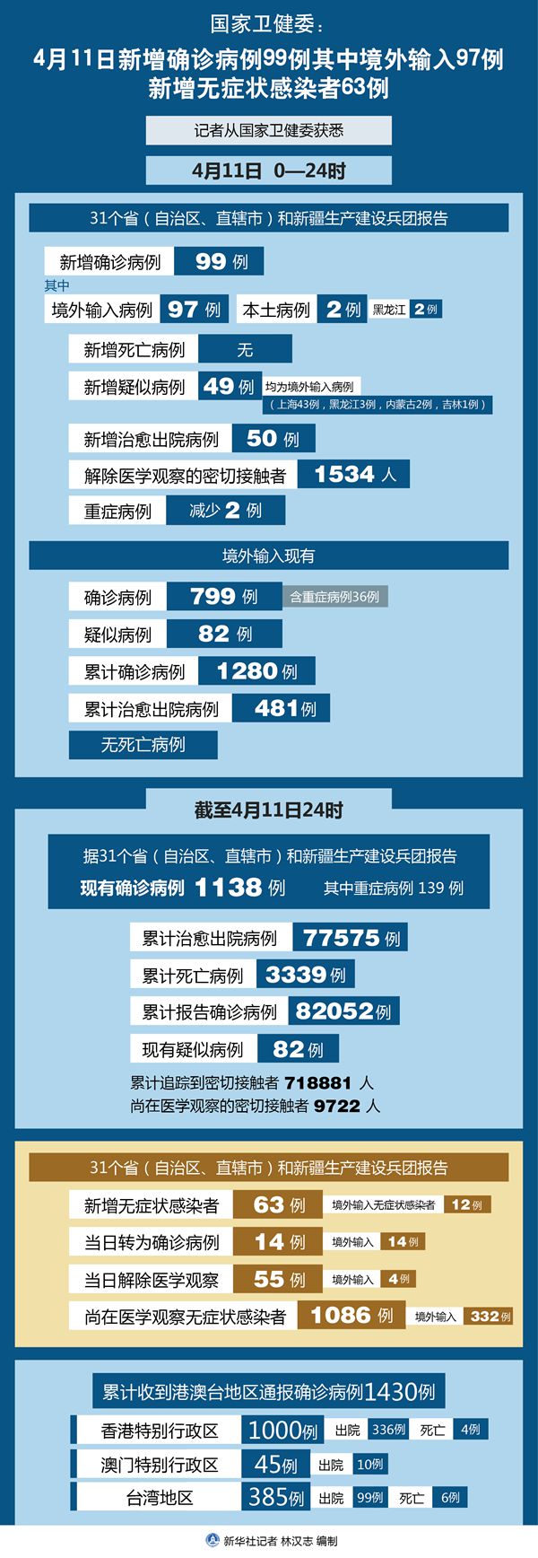 截至4月11日24時,據(jù)31個?。ㄗ灾螀^(qū)、直轄市)和新疆生產(chǎn)建設兵團報告,現(xiàn)有確診病例1138例(其中重癥病例139例),累計治愈出院病例77575例,累計死亡病例3339例,累計報告確診病例82052例,現(xiàn)有疑似病例82例。累計追蹤到密切接觸者718881人,尚在醫(yī)學觀察的密切接觸者9722人。
