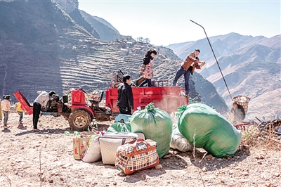 會澤縣易地扶貧搬遷的鄉(xiāng)親們在運送行李。