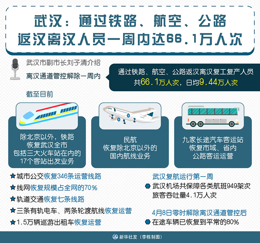 新華社武漢4月15日電(記者李偉、王作葵)武漢市副市長(zhǎng)劉子清介紹,離漢通道管控解除一周內(nèi),通過(guò)鐵路、航空、公路返漢離漢復(fù)工復(fù)產(chǎn)人員共66.1萬(wàn)人次,日均9.44萬(wàn)人次。