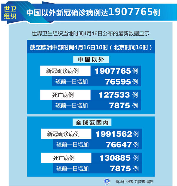 世衛(wèi)組織每日疫情報(bào)告顯示,截至歐洲中部時(shí)間16日10時(shí)(北京時(shí)間16時(shí)),中國(guó)以外新冠確診病例較前一日增加76595例,達(dá)到1907765例;中國(guó)以外死亡病例較前一日增加7875例,達(dá)到127533例。