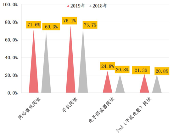 具體來看,2019年有76.1%的成年國民進(jìn)行過手機(jī)閱讀,71.6%的成年國民進(jìn)行過網(wǎng)絡(luò)在線閱讀,24.8%的成年國民在電子閱讀器上閱讀,21.3%的成年國民使用Pad(平板電腦)進(jìn)行數(shù)字化閱讀,均較2018年有所上升。