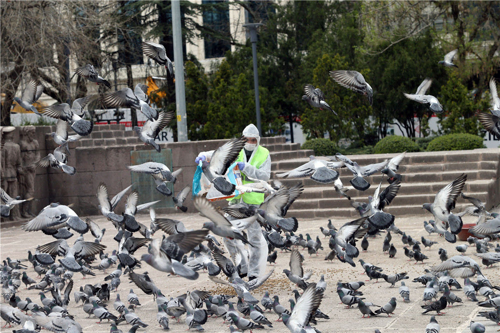 4月11日,土耳其首都、第二大城市安卡拉首度實(shí)施周末“居家令”時(shí),政府工作人員給鴿子喂食 。新華社發(fā)(穆斯塔法·卡亞攝)