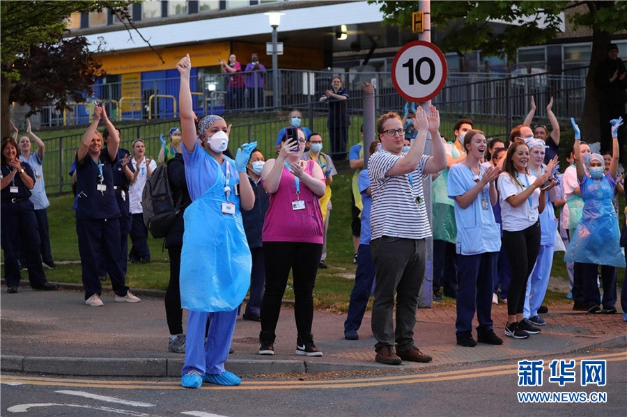 4月23日,在英國雷丁,皇家伯克郡醫(yī)院的醫(yī)護人員在醫(yī)院外鼓掌。新冠疫情暴發(fā)以來,每周四晚八時,英國人在陽臺、門前或窗前鼓掌,向醫(yī)護人員致敬。部分醫(yī)院的醫(yī)護人員也忙里偷閑走出醫(yī)院,感謝人們的支持,也為自己鼓掌加油。新華社發(fā)(蒂姆·愛爾蘭攝)