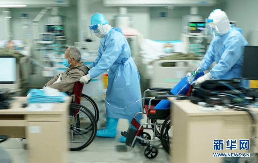 4月12日,北京協(xié)和醫(yī)院醫(yī)療隊隊員與武漢同濟醫(yī)院醫(yī)務(wù)人員共同將一名新冠肺炎危重癥患者轉(zhuǎn)往武漢同濟醫(yī)院中法新城院區(qū)ICU。在轉(zhuǎn)運過程中,ECMO(人工膜肺)治療仍在持續(xù)進行。?新華社記者 沈伯韓 攝