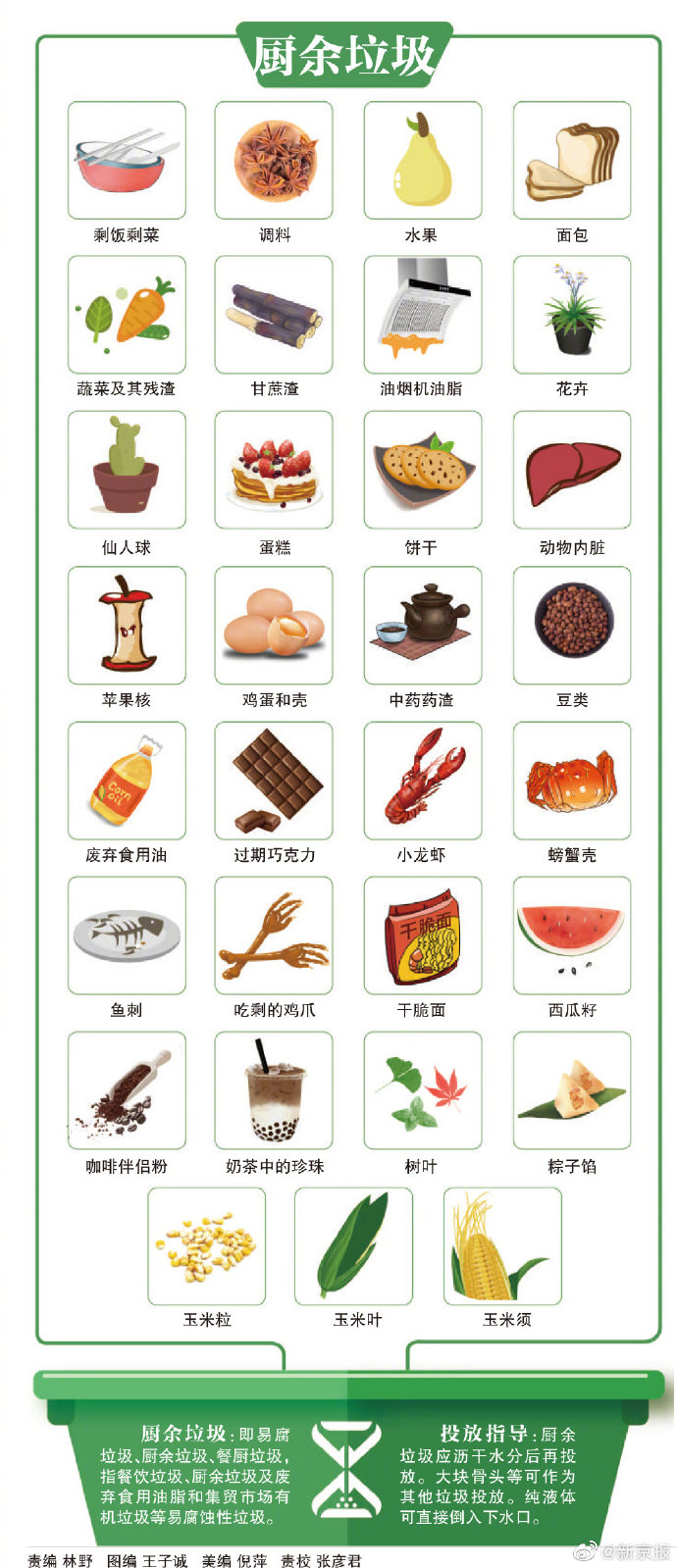 “廚余垃圾”,指家庭中產(chǎn)生的菜幫菜葉、瓜果皮核、剩菜剩飯、廢棄食物等易腐垃圾;企業(yè)和機關(guān)、部隊、學(xué)校、企業(yè)事業(yè)等單位集體食堂產(chǎn)生的食物殘渣、食品加工廢料和廢棄食用油脂;以及農(nóng)貿(mào)市場、農(nóng)產(chǎn)品批發(fā)市場產(chǎn)生的蔬菜瓜果垃圾、腐肉、肉碎骨、水產(chǎn)品、畜禽內(nèi)臟等。