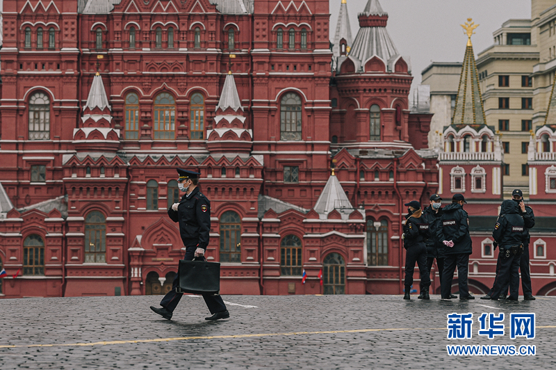 5月4日,一名警察(左)經(jīng)過(guò)俄羅斯莫斯科紅場(chǎng)。 為遏制新冠疫情蔓延,3月30日起莫斯科和俄多城實(shí)施居家隔離制度。 新華社發(fā)(葉甫蓋尼·西尼岑攝)