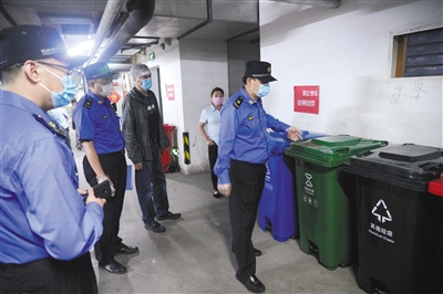 昨日,城管隊(duì)員檢查翠微大廈物業(yè)的垃圾分類收集容器。北京市城管執(zhí)法局供圖