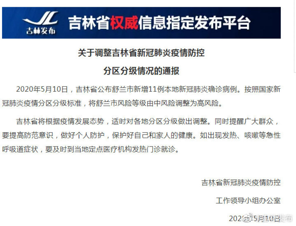 【關(guān)于調(diào)整吉林省新冠肺炎疫情防控分區(qū)分級情況的通報】2020年5月10日,吉林省公布舒蘭市新增11例本地新冠肺炎確診病例。按照國家新冠肺炎疫情分區(qū)分級標準,將舒蘭市風(fēng)險等級由中風(fēng)險調(diào)整為高風(fēng)險。