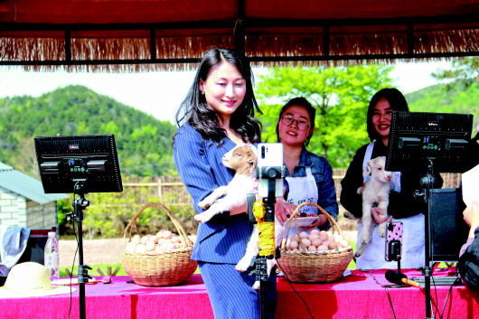 4月7日,在安徽香茗山的喜樂田園農(nóng)場,太湖縣副縣長唐翔與網(wǎng)友互動。 受訪者供圖