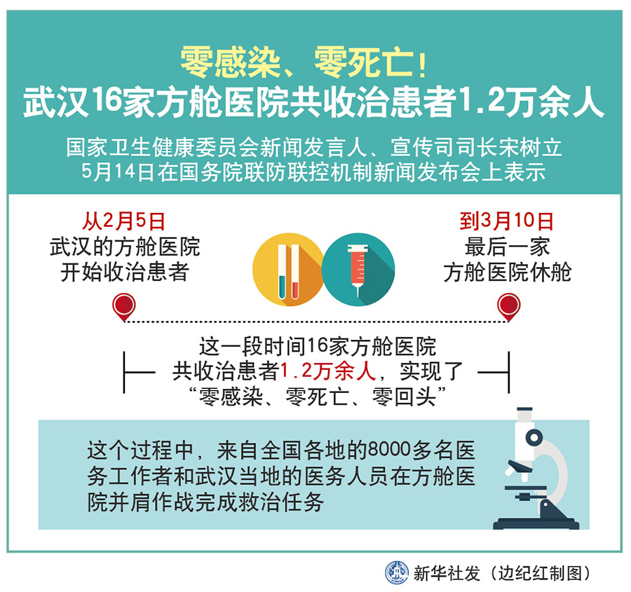 新華社北京5月14日電(記者劉羊旸、田曉航)國家衛(wèi)生健康委員會新聞發(fā)言人、宣傳司司長宋樹立14日在國務(wù)院聯(lián)防聯(lián)控機(jī)制新聞發(fā)布會上表示,從2月5日武漢的方艙醫(yī)院開始收治患者,到3月10日最后一家方艙醫(yī)院休艙,這一段時(shí)間16家方艙醫(yī)院共收治患者1.2萬余人,實(shí)現(xiàn)了“零感染、零死亡、零回頭”。