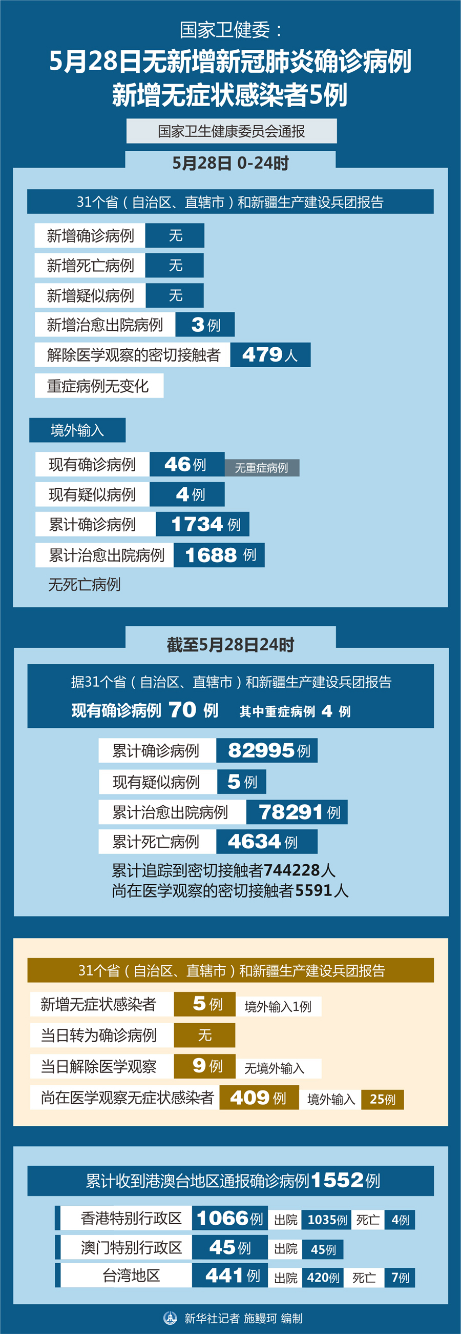 截至5月28日24時(shí),據(jù)31個(gè)?。ㄗ灾螀^(qū)、直轄市)和新疆生產(chǎn)建設(shè)兵團(tuán)報(bào)告,現(xiàn)有確診病例70例(其中重癥病例4例),累計(jì)治愈出院病例78291例,累計(jì)死亡病例4634例,累計(jì)報(bào)告確診病例82995例,現(xiàn)有疑似病例5例。累計(jì)追蹤到密切接觸者744228人,尚在醫(yī)學(xué)觀察的密切接觸者5591人。